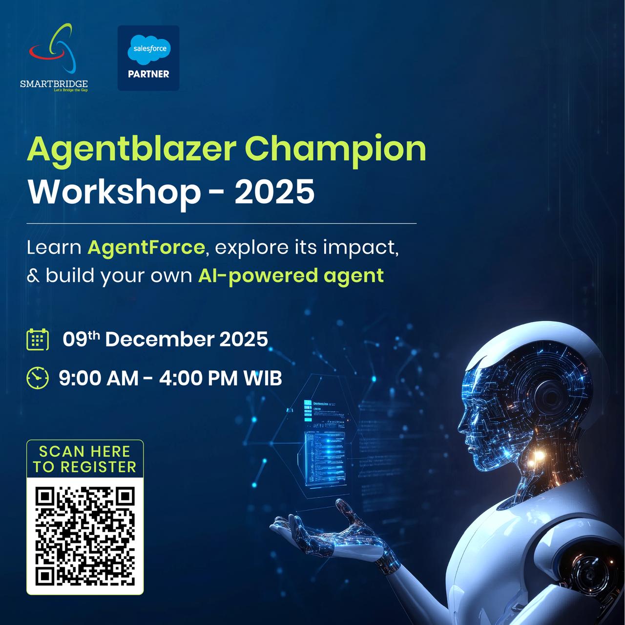Ikuti Agentblazer Champion Workshop bersama SmartBridge dan Salesforce. Dalam sesi ini, peserta akan mempelajari dasar-dasar AgentForce, memahami penerapannya di dunia kerja, serta mempraktikkan secara langsung cara membangun AI agent versi masing-masing.