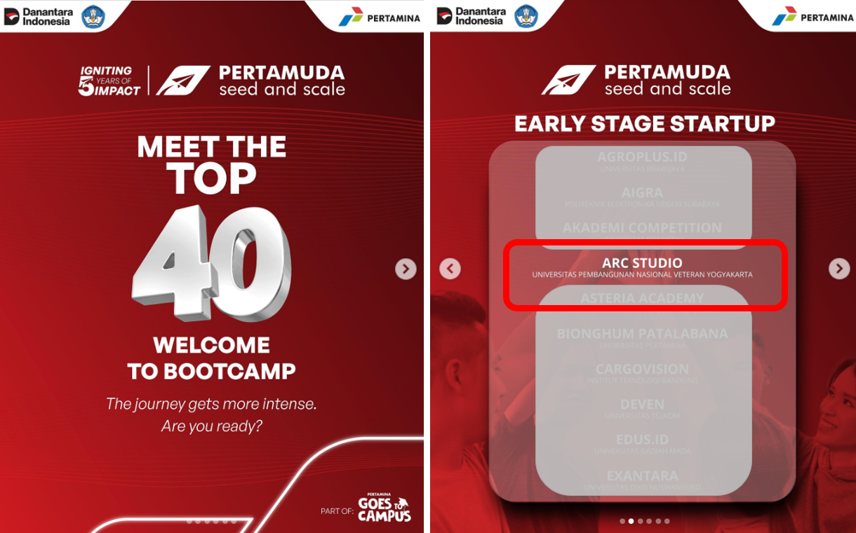 Pengumuman ini didasarkan pada informasi resmi yang dirilis oleh penyelenggara, yang menyatakan, "Selamat untuk 40 tim terbaik yang berhasil melangkah ke tahap Bootcamp Pertamuda Seed & Scale 2025! ???? Congratulations, you’ve made it this far, but the real challenge starts now. ????" Pencapaian ini merupakan validasi atas kualitas ide bisnis dan potensi skalabilitas yang dimiliki oleh ARC Studio.