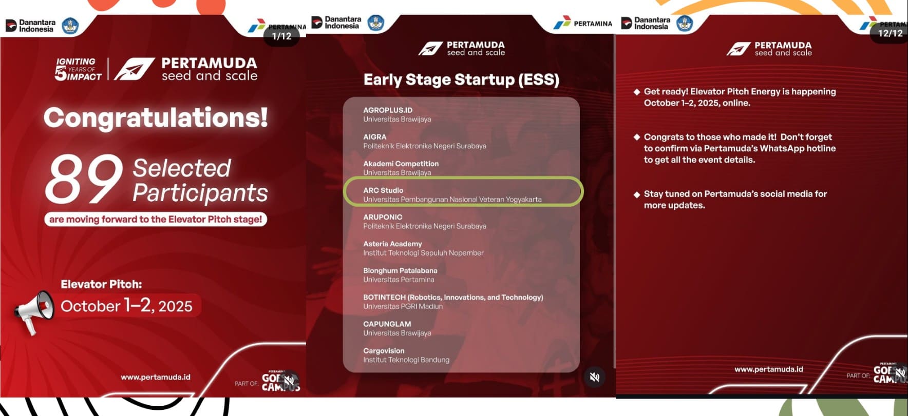 Kabar membanggakan datang dari Universitas Pembangunan Nasional (UPN) “Veteran” Yogyakarta, setelah salah satu tim *startup* binaannya, ARC Studio, berhasil memastikan diri lolos ke tahap Elevator Pitch program PERTAMUDA seed and scale 2025. Pengumuman yang disampaikan oleh Pertamuda menunjukkan bahwa ARC Studio termasuk dalam daftar 89 peserta terpilih yang maju ke babak krusial ini. Sebagai tim yang berasal dari Universitas Pembangunan Nasional Veteran Yogyakarta dan merupakan tim binaan inkubasi bisnis UPA PKK UPNYK, pencapaian ini menegaskan kualitas dan potensi inovasi yang dikembangkan oleh mahasiswa “Kampus Bela Negara” tersebut, khususnya di kategori Early Stage Startup (ESS).