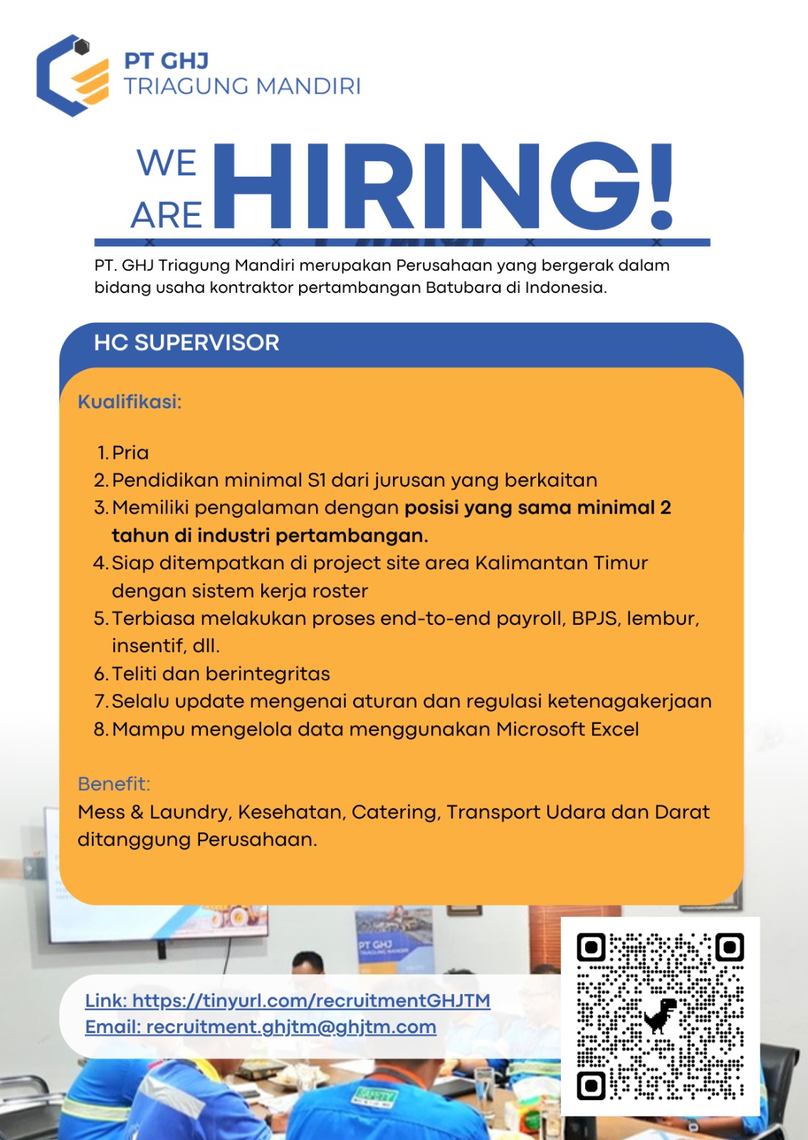 Kesempatan ini ideal bagi profesional HC yang ingin berkarier di lingkungan proyek pertambangan dengan tantangan operasional yang dinamis dan ruang kontribusi nyata dalam penguatan tata kelola SDM. Hanya kandidat yang memenuhi kualifikasi yang akan diproses ke tahap seleksi berikutnya.