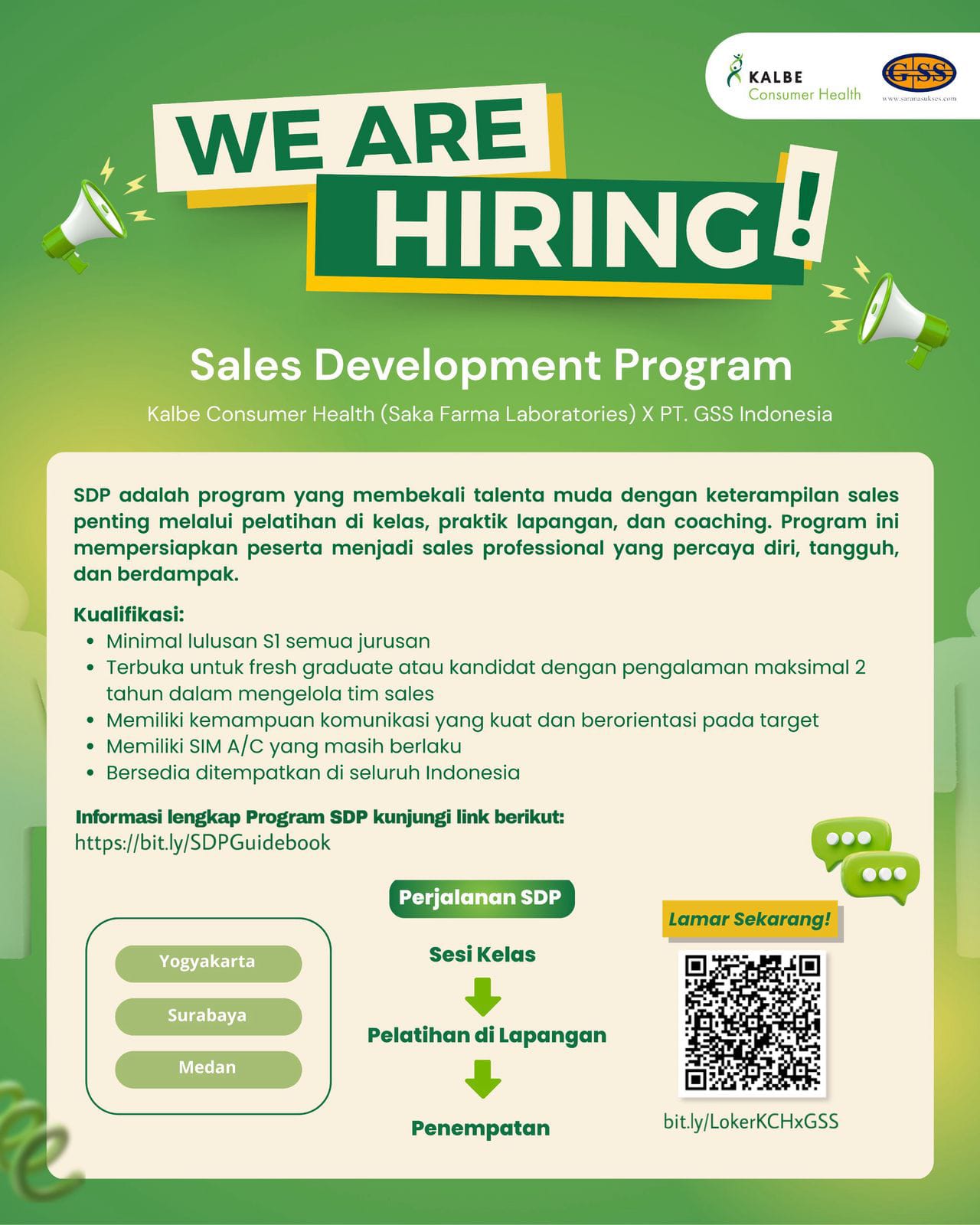 UPA Pengembangan Karir dan Kewirausahaan UPN Veteran Yogyakarta menyampaikan informasi peluang karier bagi lulusan dan mahasiswa tingkat akhir. Kalbe Consumer Health (Saka Farma Laboratories) bekerja sama dengan PT GSS Indonesia membuka Sales Development Program (SDP) untuk penempatan di berbagai wilayah Indonesia.