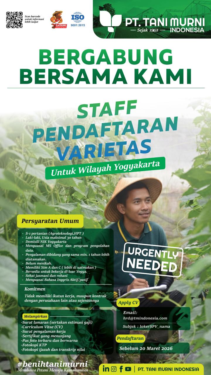 Halo alumni dan pencari kerja, ada kabar gembira nih buat kamu yang berdomisili di Yogyakarta dan berlatar belakang pertanian. PT Tani Mandiri Indonesia membuka kesempatan buat kamu yang ingin bergabung sebagai Staff Pendaftaran Varietas. Posisi ini khusus untuk wilayah Yogyakarta, jadi buat kamu yang ber-NIK Yogyakarta, yuk merapat!
