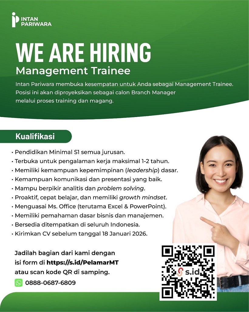 Intan Pariwara membuka kesempatan berkarier bagi talenta muda untuk bergabung sebagai Management Trainee. Program ini dirancang sebagai jalur percepatan karier yang mempersiapkan peserta menjadi kandidat Branch Manager melalui rangkaian training dan magang. Selama program, peserta akan mendapatkan pembelajaran terarah, pengalaman kerja nyata, serta penguatan kompetensi dasar manajerial yang relevan dengan kebutuhan organisasi. Kesempatan ini cocok bagi lulusan baru maupun profesional muda yang ingin mengembangkan kapasitas kepemimpinan, kemampuan analitis, serta keterampilan komunikasi dalam lingkungan kerja yang dinamis.