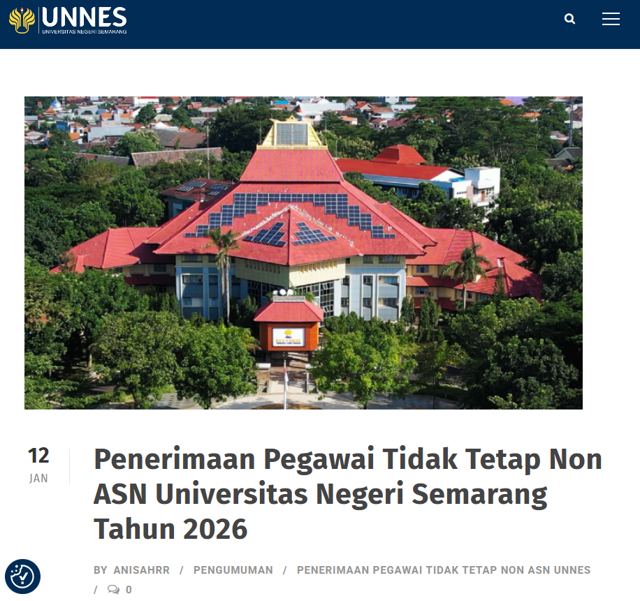 Universitas Negeri Semarang (UNNES) membuka Penerimaan Pegawai Tidak Tetap Non ASN Tahun 2026 berdasarkan Pengumuman Nomor: B/1756/UN37/KP.04.00/2026. Rekrutmen ini ditujukan untuk memenuhi kebutuhan sumber daya manusia guna mendukung pelaksanaan kegiatan akademik dan nonakademik di lingkungan UNNES. Seleksi terbuka bagi Warga Negara Indonesia yang memenuhi persyaratan umum dan persyaratan khusus sesuai ketentuan.